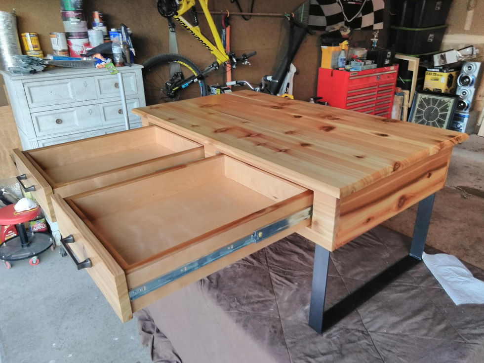 This gorgeous custom wooden coffee table with fabricated metal legs, open drawers, and a lift-top mechanism built entirely by My Guy Ty.