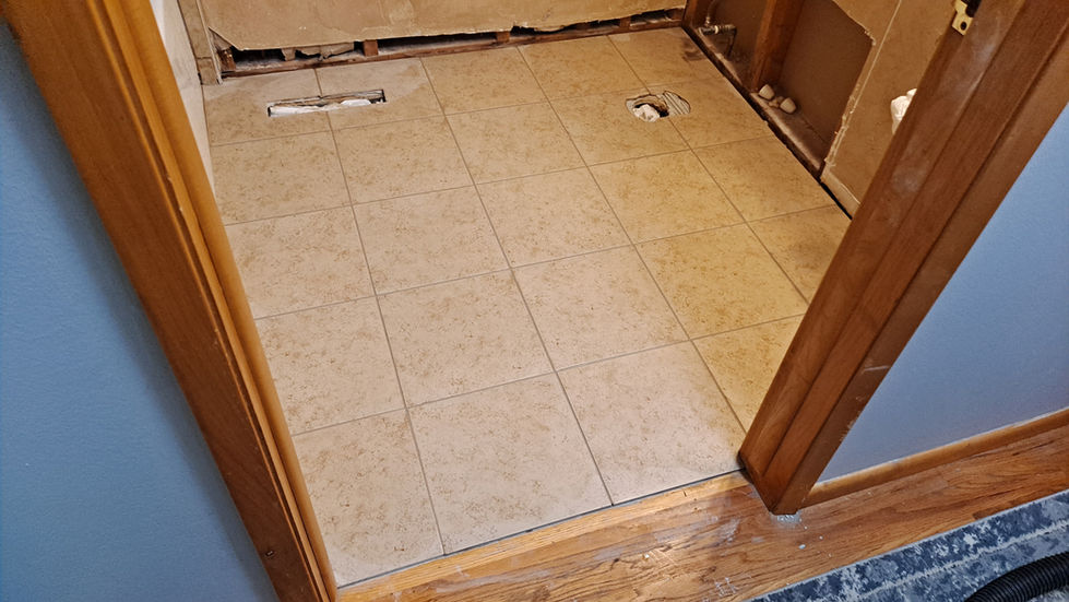 A compilation of images showcasing various home renovation projects, including a room under renovation, damaged roof shingles, window installations, and newly tiled bathroom floor under construction.